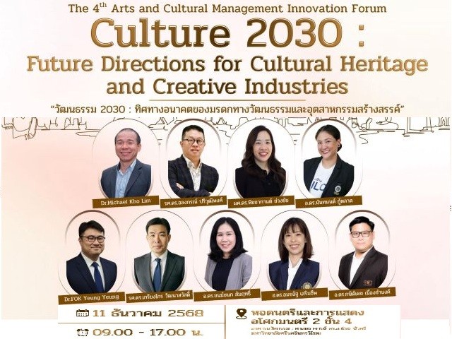 ขอเชิญผู้สนใจเข้าร่วมพิธีการเปิดโครงการ ACMI FORUM ครั้งที่ 4 และร่วมรับฟังการอภิปรายและการบรรยาย หัวข้อ Culture 2030: Future Directions for Cultural Heritage and Creative Industries วันที่ 11 ธ.ค.68 ตั้งแต่เวลา 9.00 – 17.00 น. ณ หอดนตรีและการแสดงอโศกมนตรี 2 ชั้น 4 อาคารนวัตกรรม ศาสตราจารย์ ดร.สาโรช บัวศรี มศว