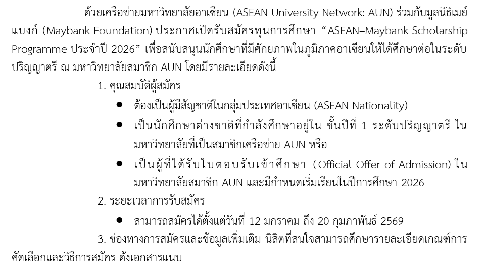 Home/ข่าว/ข่าวประชาสัมพันธ์/ASEAN University Network :AUN ร่วมกับมูลนิธิเมย์ ประกาศเปิดรับสมัครทุนการศึกษา ASEAN-Maybank Scholarship Programme ประจำปี 2026 รับสมัครถึง 12 ม.ค. ถึง 20 ก.พ. 69