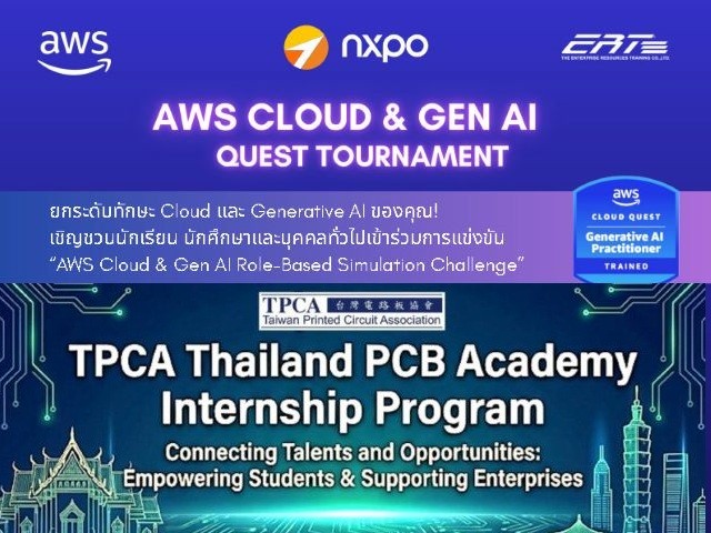 ขอเชิญนิสิต, บุคลากร และบุคคลที่สนใจเข้าร่วมโครงการ AWS Cloud & Gen AI Quest Tournament ลงทะเบียน 9 ธ.ค.68 และ โครงการ TPCA Intership Program โดย Taiwan Printed Circuit Association (TPCA) ลงทะเบียน 12 ธ.ค. 68