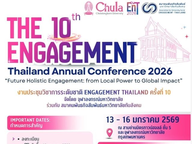 ขอเชิญชวนคณาจารย์ บุคลากร และนิสิตที่สนใจ เข้าร่วมและส่งผลงานวิชาการเพื่อนำเสนอในงานประชุม วิชาการระดับชาติ Engagement Thailand ครั้งงที่ 10