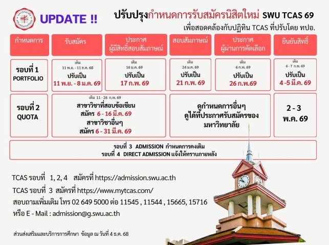 แจ้งปรับปรุงกำหนดการคัดเลือกเข้าเป็นนิสิตระดับปริญญาตรี SWU TCAS 69 Portfolio วันที่ 11 พ.ย. – 8 ม.ค 69 ระบบปิดเวลา 15.00 น.