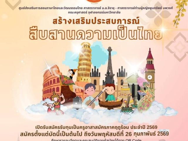 ขอเชิญผู้สนใจเข้าสมัครคัดเลือกครูอาสาสมัครเข้าร่วม โครงการสอนภาษาไทยและวัฒนธรรมไทยในต่างประเทศ ประจำปี พ.ศ. 2569 รอบที่ 3 สมัครได้ถึงวันที่ 26 ก.พ.69