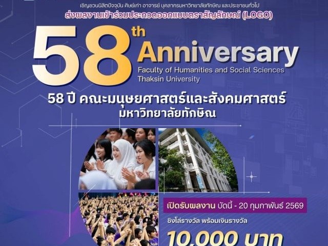 ขอเชิญผู้สนใจร่วมส่งผลงานเข้าร่วมการประกวดออกแบบตราสัญลักษณ์ (LOGO) ในโอกาสครบรอบ 58 ปี คณะมนุษยศาสตร์และสังคมศาสตร์ ม.ทักษิณ ชิงโล่รางวัลพร้อมเงินรางวัล 1 หมื่นบาท ส่งผลงานได้ถึงวันที่ 20 ก.พ. 69