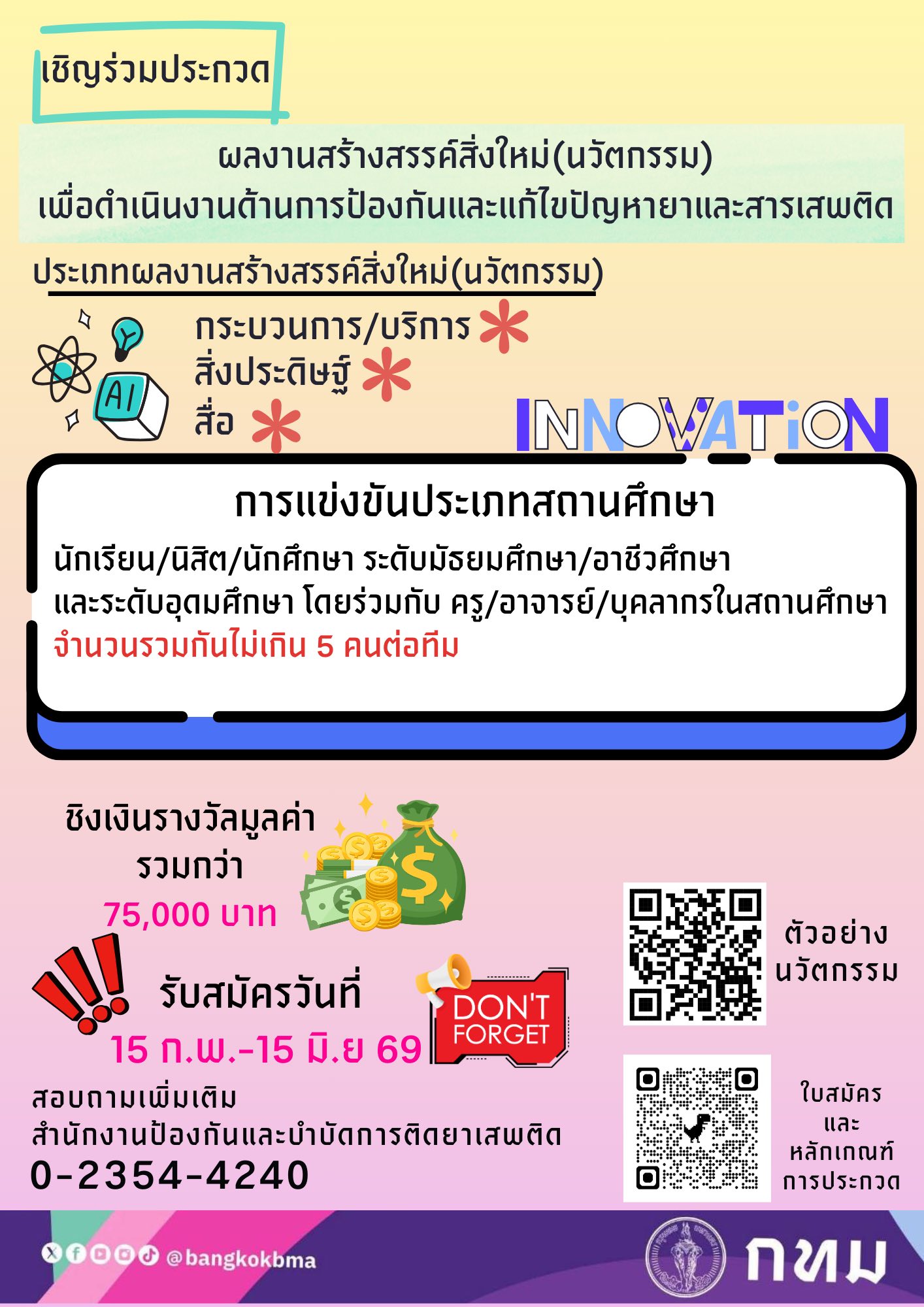 ขอเชิญผู้สนใจส่งผลงานเข้าประกวดในโครงการประกวดนวัตกรรมเพื่อการป้องกันและแก้ไขปัญหายาเสพติด ชิงเงินรางวัลรวมกว่า 75,000 บาท รับสมัครถึง 15 มิ.ย.69