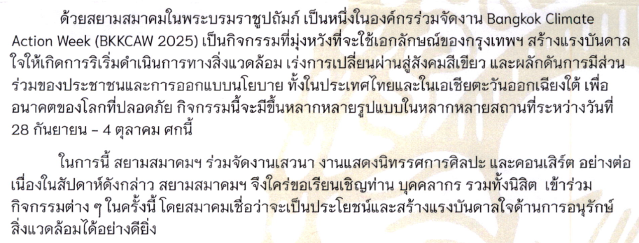 ขอเชิญผู้สนใจเข้าร่วมกิจกรรมงานเสวนา งานแสดงนิทรรศการศิลปะ และคอนเสิร์ต ในงาน Bangkok Climate Action Week (BKKCAW2025) วันที่ 28 ก.ย.68 – 4 ต.ค. 68 ณ หอประชุม สยามสมาคมในพระบรมราชูปถัมภ์
