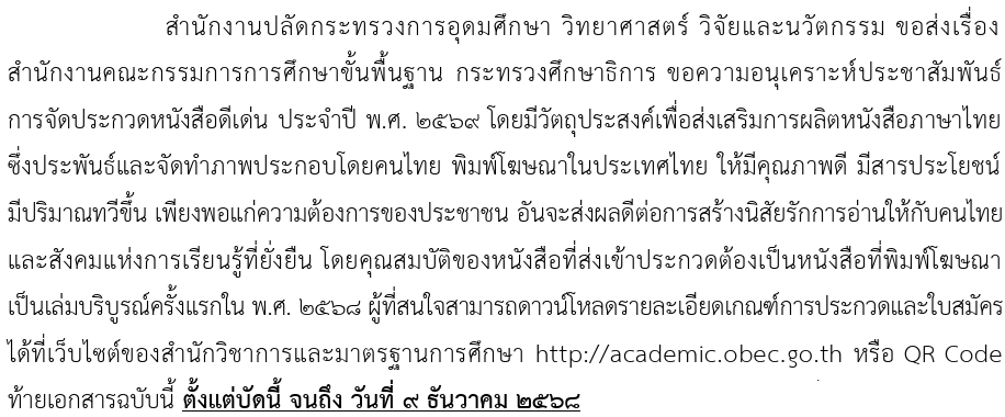 เกณฑ์การประกวดหนังสือดีเด่น 2569 https://academic.obec.go.th/web/images/news/1760068221_d_1.pdf