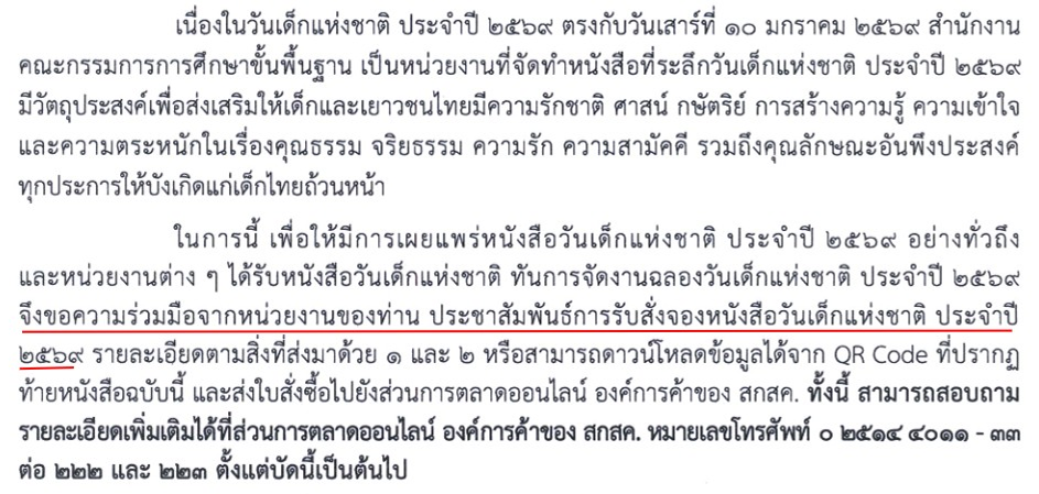 ประชาสัมพันธ์การสั่งจองหนังสือวันเด็กแห่งชาติประจำปี 2569 ในราคาพิเศษเล่มละ 13 บาท (จัดส่งฟรี) สั่งซื้อภายในวันที่ 22 ธันวาคม 2568