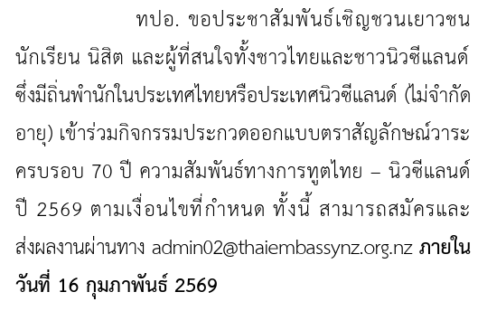 ขอเชิญนิสิตและผู้สนใจส่งผลงานเข้าร่วมการประกวดออกแบบตราสัญลักษณ์วาระครบรวบ 70 ปี ความสัมพันธ์ทางการฑูตไทย – นิวซีแลนด์ ปี 2569 ส่งผลงานทาง email ภายในวันที่ 16 ก.พ. 69