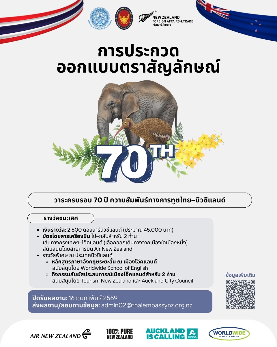 Home/ข่าว/ข่าวประชาสัมพันธ์/ขอเชิญนิสิตและผู้สนใจส่งผลงานเข้าร่วมการประกวดออกแบบตราสัญลักษณ์วาระครบรวบ 70 ปี ความสัมพันธ์ทางการฑูตไทย – นิวซีแลนด์ ปี 2569 ส่งผลงานทาง email ภายในวันที่ 16 ก.พ. 69