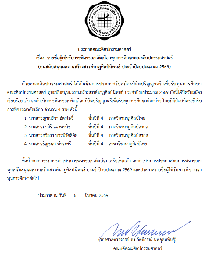 ประกาศ เรื่อง รายชื่อผู้เข้ารับการพิจารณาคัดเลือกทุนการศึกษาคณะศิลปกรรมศาสตร์ (ทุนสนับสนุนผลงานสร้างสรรค์นาฏศิลป์นิพนธ์ ประจำปีงบประมาณ 2569)