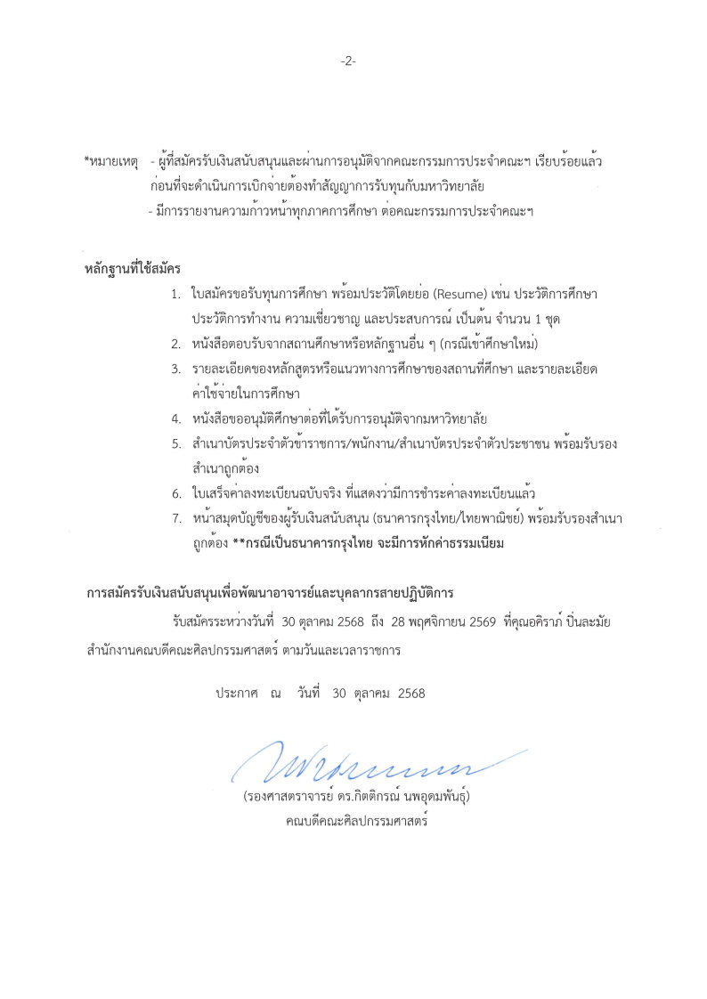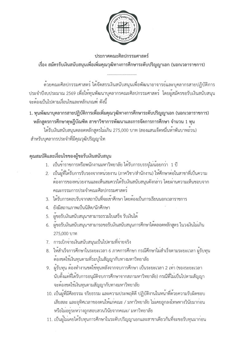ประกาศคณะศิลปกรรมศาสตร์ เรื่อง สมัครรับเงินสนับสนุนเพื่อเพิ่มคุณวุฒิทางการศึกษาระดับปริญญาเอก (นอกเวลาราชการ) ประจำปีงบประมาณ 2569 รับสมัครถึง 28 พ.ย. 69