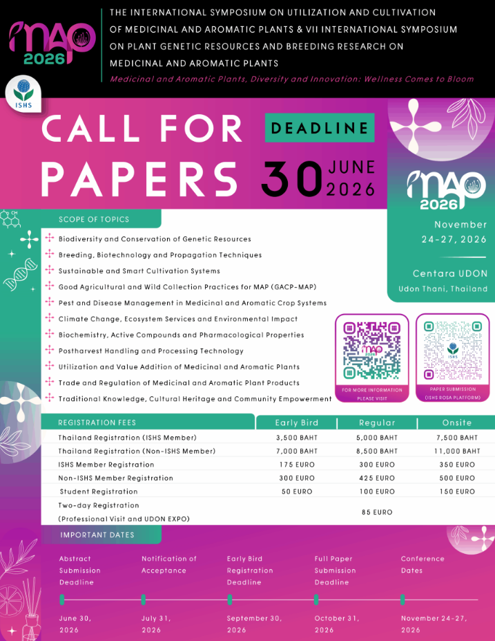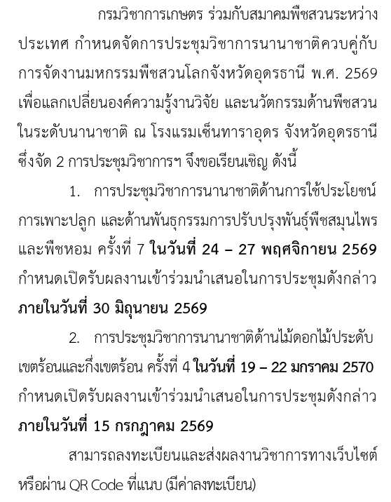 กรมวิชาการเกษตร ร่วมกับสมาคมพืชสวนระหว่างประเทศ ขอเชิญส่งผลงานเข้าร่วมนำเสนอในการประชุมวิชาการนานาชาติฯ 1.ด้านพืชสมุนไพรและพืชหอมเปิดรับผลงานถึงวันที่ 30 มิ.ย. 69 2.ด้านไม้ดอกไม้ประดับเขตร้อนและกึ่งเขตร้อน เปิดรับผลงานถึงวันที่ 15 ก.ค.69