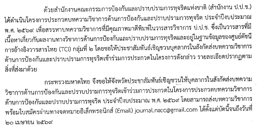 Home/ข่าว/ข่าวประชาสัมพันธ์/ขอเชิญผู้สนใจส่งบทความวิชาการเข้าร่วมประกวดในโครงการประกวดบทความวิชาการด้านการป้องกันและปราบปรามการทจริต ประจำปีงบประมาณ พ.ศ.2569 ส่งผลงานได้ถึงวันที่ 20 เม.ย.69