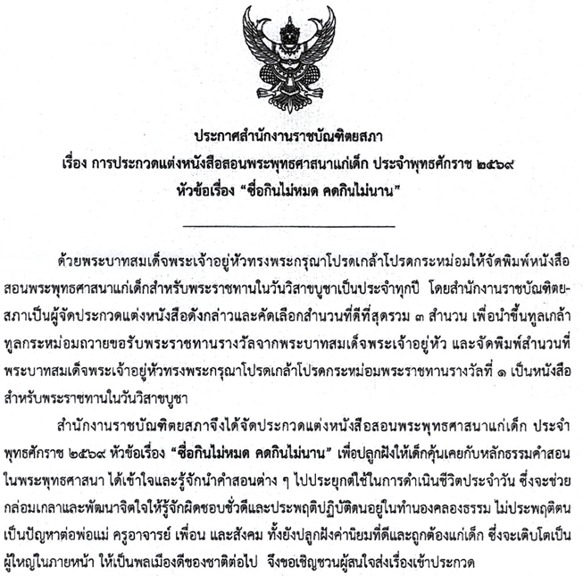 ขอเชิญส่งผลงานเข้าประกวดแต่งหนังสือสอนพระพุทธศาสนาแก่เด็กอายุไม่เกิน 15 ปี ในหัวข้อเรื่อง “ซื่อกินไม่หมด คดกินไม่นาน” จัดโดยสำนักงานราชบัณฑิตยสภา ส่งผลงานด้วยตนเอง หรือทางไปรษณีย์ ภายในวันที่ 15 ธ.ค.68