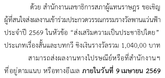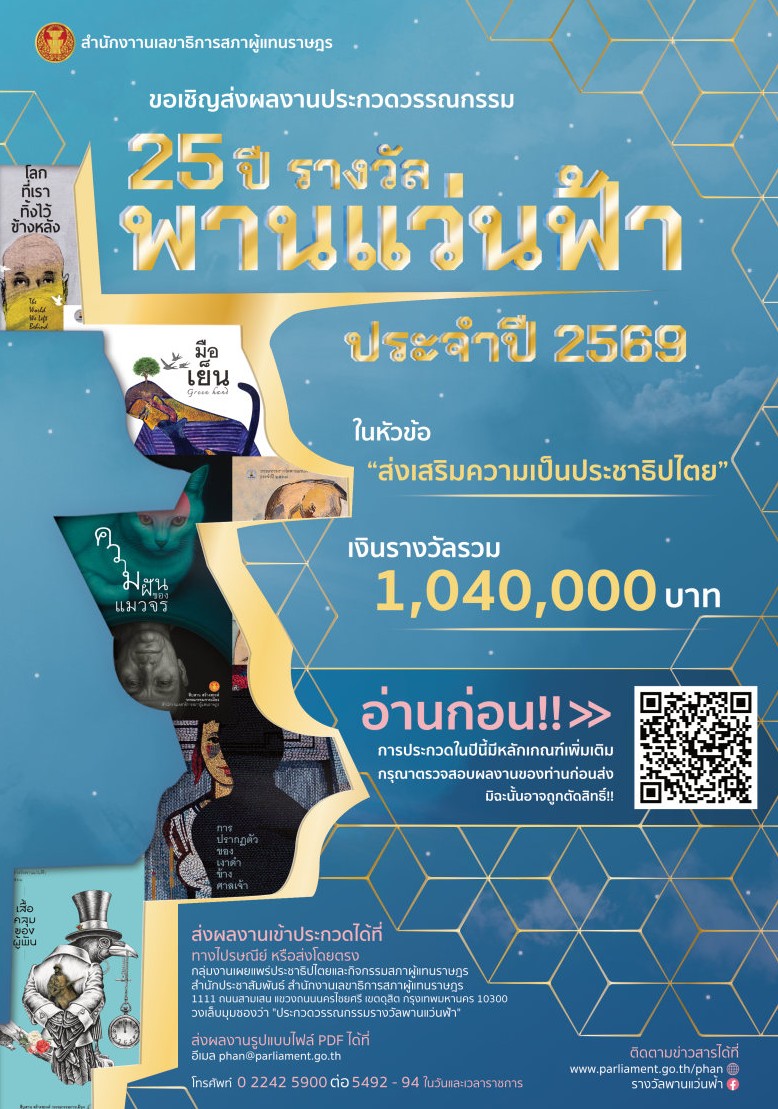 ขอเชิญผู้สนใจส่งผลงานเข้าร่วมประกวดวรรณกรรมรางวัลพานแว่นฟ้า ประจำปี 2569 ในหัวข้อ ส่งเสริมความเป็นประชาธิปไตย ประเภทเรื่องสั้นและบทกวี ชิงเงินรางวัล 1,040,000 บาท ส่งผลงานได้ถึงวันที่ 9 เม.ย.69
