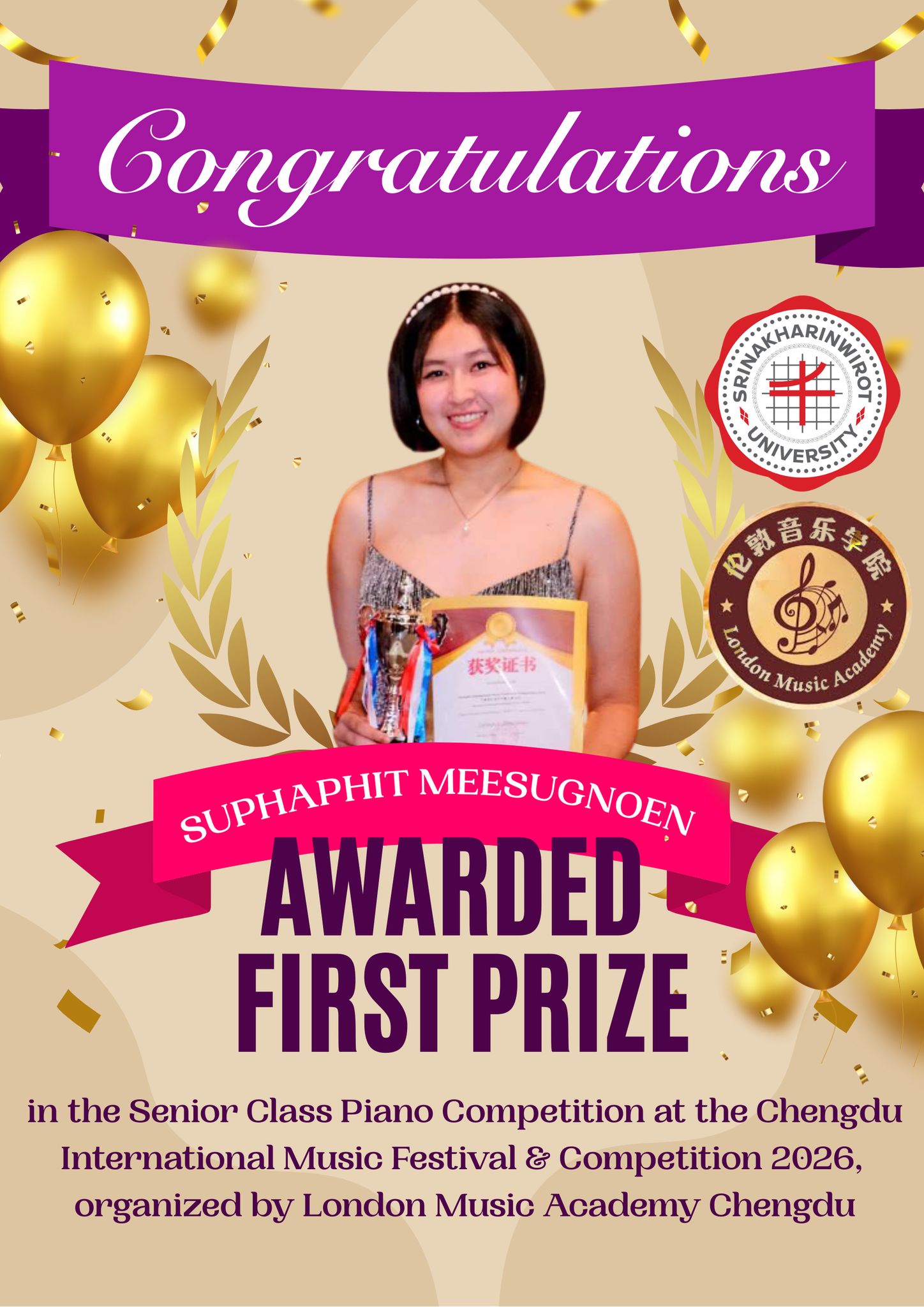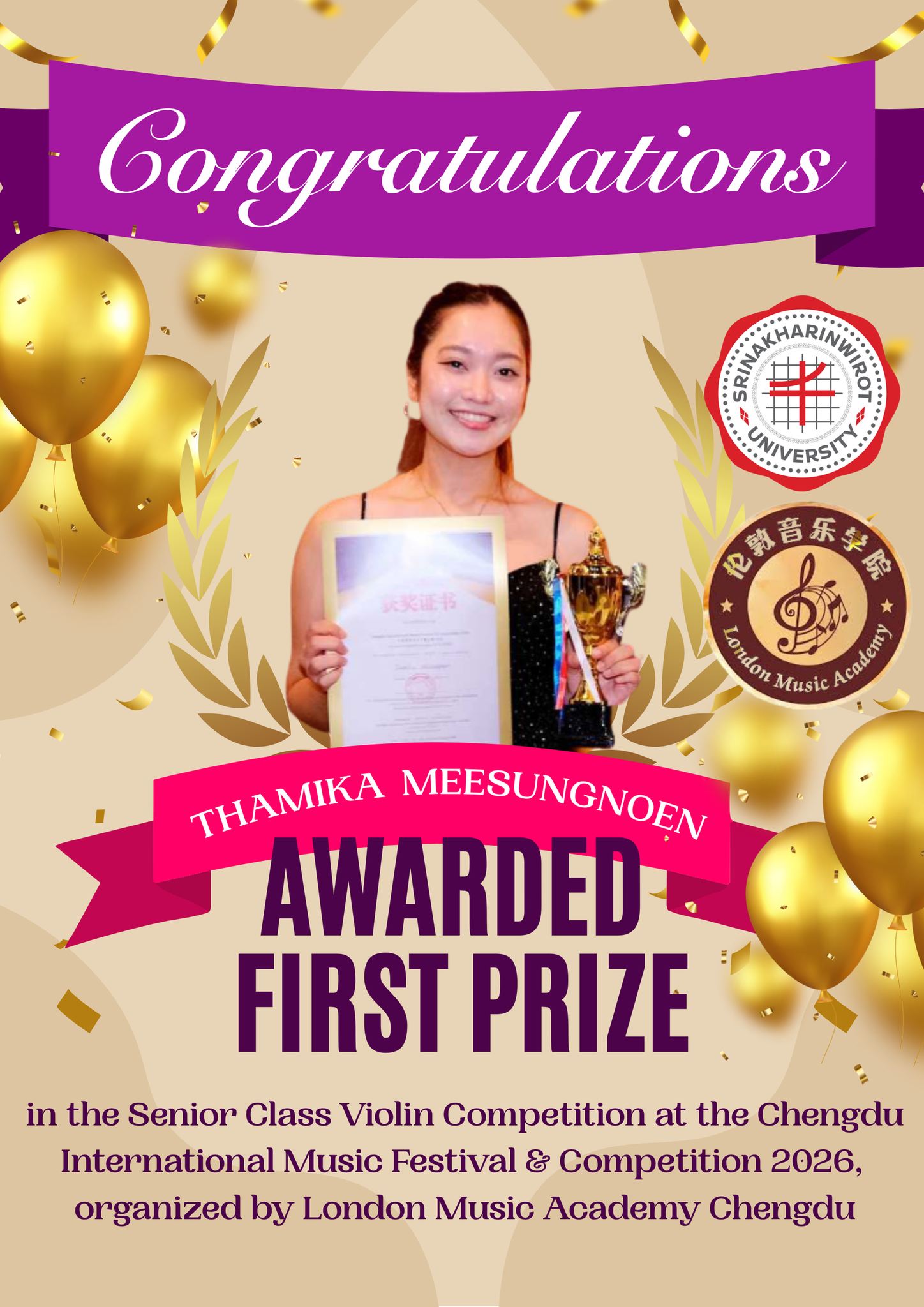 คณะศิลปกรรมศาสตร์ ขอแสดงความยินดีกับ นางสาวธรรมิกา มีสูงเนิน (ไวโอลิน) ชั้นปีที่ 4 และ นางสาวสุภาภิชญ์ มีสูงเนิน (เปียโน) ชั้นปีที่ 2 นิสิตภาควิชาดุริยางคศาสตร์สากล คณะศิลปกรรมศาสตร์ มศว ที่ได้รับรางวัล First Prize ประเภท Senior Class จากการแข่งขันดนตรีเยาวชนนานาชาติ ในรายการ Chengdu International Music Festival & Competition 2026 จัดโดย London Music Academy Chengdu ณ เมืองเฉิงตู ประเทศจีน เมื่อวันที่ 17 มกราคม 2569 ภายใต้การกำกับดูแลของ ผู้ช่วยศาสตราจารย์ ดร.ประพันธ์ศักดิ์ พุ่มอินทร์![]()