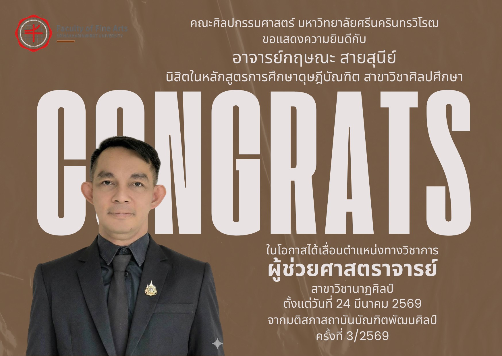 ขอแสดงความยินดีกับ อาจารย์กฤษณะ สายสุนีย์ นิสิตในหลักสูตรการศึกษาดุษฎีบัณฑิต สาขาวิชาศิลปศึกษา คณะศิลปกรรมศาสตร์ ในโอกาสได้เลื่อนตำแหน่งทางวิชาการ ผู้ช่วยศาสตราจารย์ สาขาวิชานาฏศิลป์ ตั้งแต่วันที่ 24 มี.ค. 69