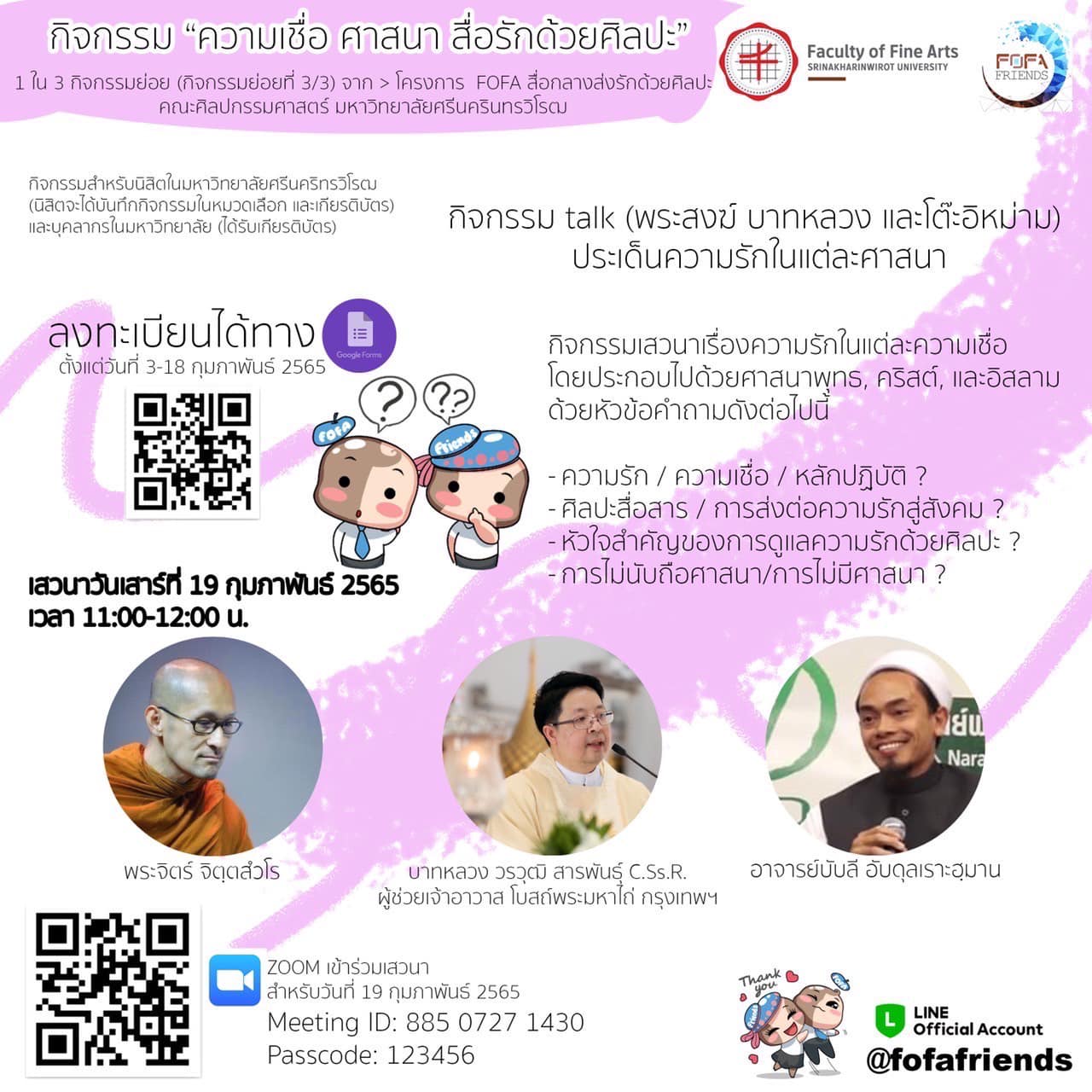 โครงการ >> “สื่อกลางส่งรักด้วยศิลปะ” จากคณะศิลปกรรมศาสตร์ มหาวิทยาลัยศรีนครินทรวิโรฒ ในวันที่ 19 กุมภาพันธ์ 2565 เวลา 11:00-12:00 น.