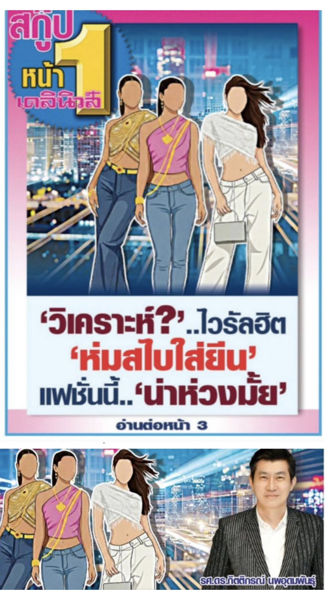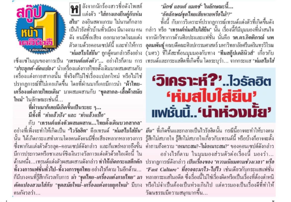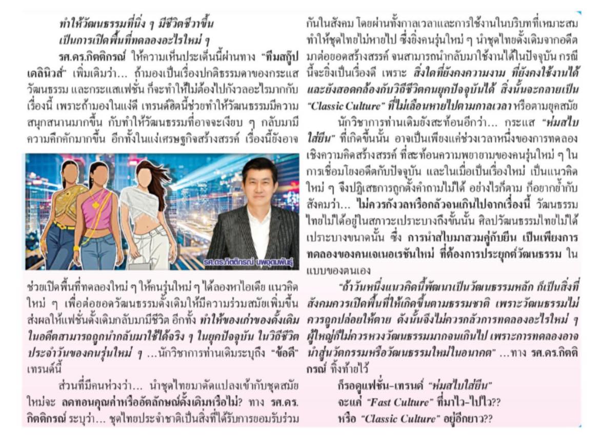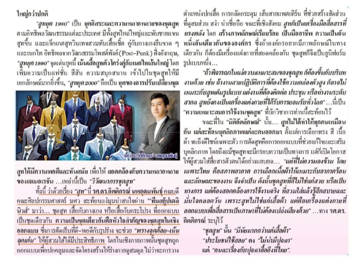 รองศาสตราจารย์ ดร.กิตติกรณ์ นพอุดมพันธุ์ คณบดีคณะศิลกรรมศาสตร์ มศ ในสื่อหนังสือพิมพ์เดลินิวส์ เรื่อง ชุดสูท ภาษาที่ไร้เสียง วันที่ 2 ก.พ. 69 และ ห่มสไบใส่ยีน วันที่ 7 ก.พ.69 fofaswu editor 2026-02-11T10:17:47+00:00 Project Description หนังสือพิมพ์เดลินิวส์ ฉบับวันที่ 2 กุมภาพันธ์ 2569 หน้า 1,3 ชุดสูท” ภาษาที่ไร้เสียง ในกระแสสังคมเรื่องตัดสูทก็ว่ากันไปตามข้อเท็จจริง สกู๊ปหน้า 1,3 หนังสือพิมพ์เดลินิวส์ ฉบับวันเสาร์ที่ 7 กุมภาพันธ์ 2569 สไบ สบายๆ ไม่ต้องห่วง จากประเด็นไวรัลViral ห่มสไบใส่ยีนส์ ในสังคมไทย