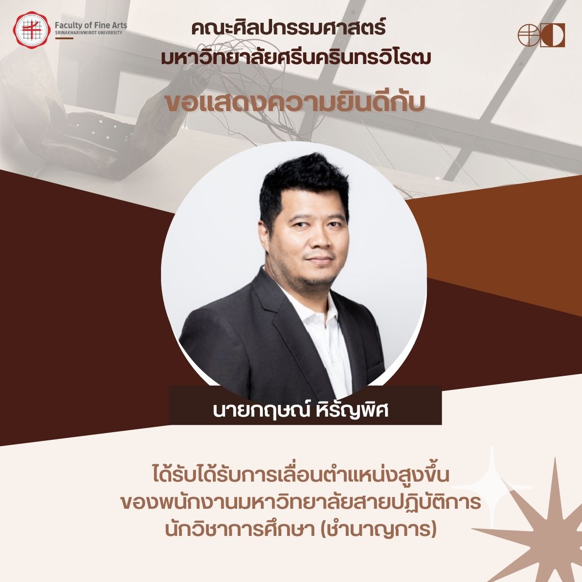 ขอแสดงความยินดีกับ นายกฤษณ์ หิรัญพิศ ในโอกาสได้รับการเลื่อนตำแหน่งสูงขึ้นของพนักงานมหาวิทยาลัยสายปฏิบัติการ ตามคำสั่ง มศว ที่ 11151/2568 ลงวันที่ 16 ต.ค.68 เป็น นักวิชาการศึกษา (ชำนาญการ)