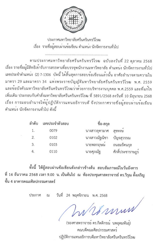 ประกาศ มศว เรื่อง รายชื่อผู้สอบผ่านข้อเขียน ตำแหน่ง นักจัดการงานทั่วไป โดยให้ผู้มีรายชื่อเข้ารับการสอบสัมภาษณ์ในวันที่ 16 ธ.ค.68 เวลา 9.00 น. ณ ห้องประชุม ศาสตราจารย์ ดร.วิรุณ ตั้งเจริญ ชั้น 4 อาคารคณะศิลปกรรมศาสตร์ มศว