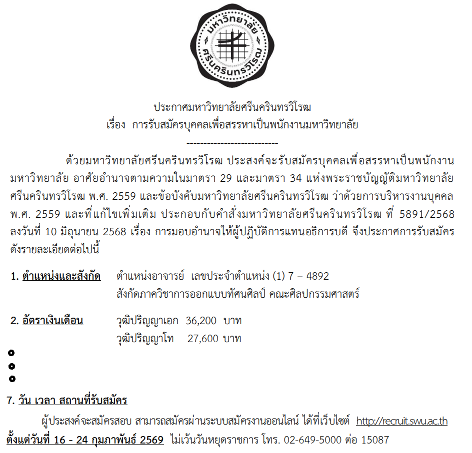 ประกาศ มศว เรื่อง การรับสมัครบุคคลเพื่อสรรหาเป็นพนักงานมหาวิทยาลัย ตำแหน่งอาจารย์ สังกัดภาวิชาการออกแบบทัศนศิลป์ คณะศิลปกรรมศาสตร์ เลขประจำตำแหน่ง (1)-7-4892 รับสมัครถึง 24 กุมภาพันธ์ 2569 อ่านประกาศฉบับเต็ม (คลิก) สมัครงานออนไลน์ ที่ http://recruit.swu.ac.th (คลิก) fofaswu editor 2026-02-17T10:53:05+00:00
