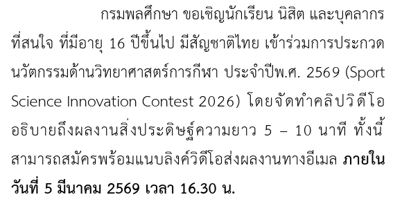 กรมพลศึกษา ขอเชิญนิสิตและบุคลากรที่สนใจ มีสัญชาติไทย ส่งผลงานคลิปวิดีโอ เข้าร่วมการประกวดนวัตกรรมด้วยวิทยาศาสตร์การกีฬา ประจำปี พ.ศ.2569 Sport Science Innovation Contest 2026