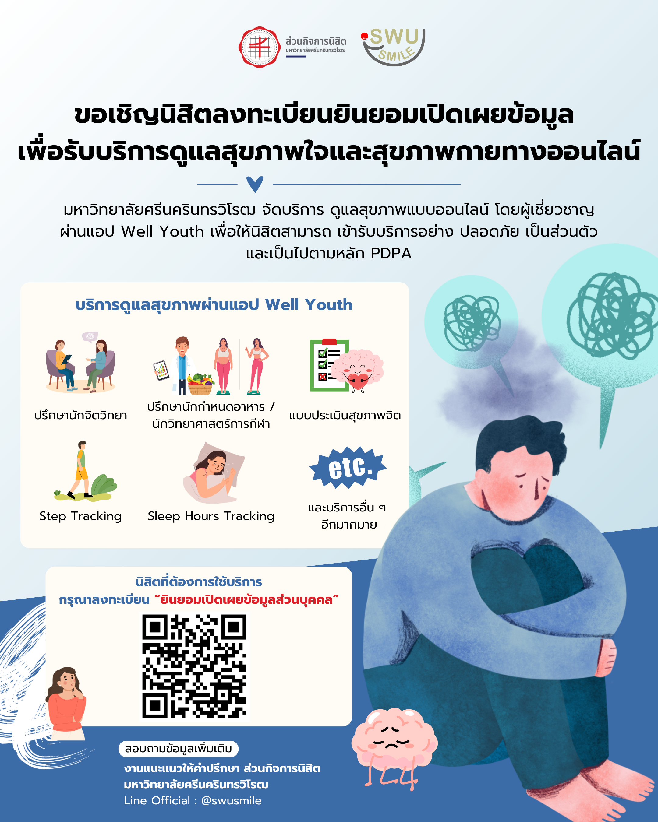 ขอเชิญนิสิตลงทะเบียนยินยอมเปิดเผยข้อมูลเพื่อรับบริการดูแลสุขภาพใจและสุขภาพกายทางออนไลน์ fofaswu editor 2025-11-20T12:19:26+00:00