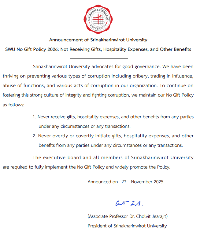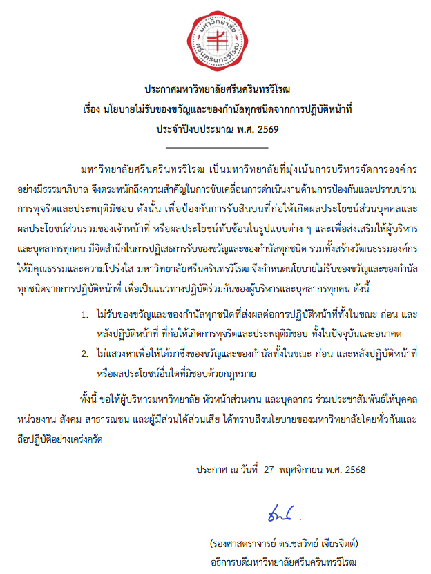 ประกาศมหาวิทยาลัยศรีนครินทรวิโรฒ เรื่อง นโยบายไม่รับของขวัญและของกำนัลทุกชนิดจากการปฏิบัติหน้าที่ ประจำปีงบประมาณ พ.ศ. 2569