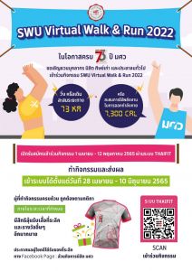 ขอเชิญชวนบุคลากร นิสิต ศิษย์เก่า และบุคคลทั่วไปเข้าร่วมกิจกรรมวิ่ง /เดิน สะสมระยะทาง 73 กิโลเมตร หรือ สะสมการใช้พลังงานในการออกกำลังกาย 7,300 แคลอรี่ กับ “SWU Virtual Walk & Run 2022”