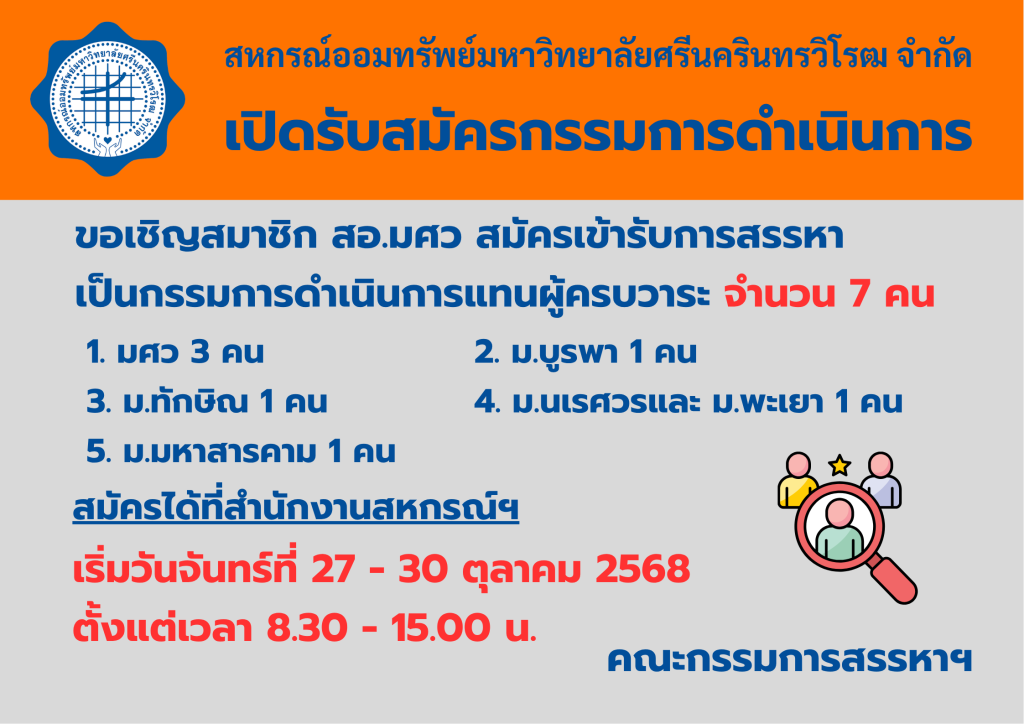 ขอเชิญสมาชิกสหกรณ์ออมทรัพย์มหาวิทยาลัยศรีนครินทรวิโรฒ จำกัด สมัครเข้ารับการสรรหารเป็นกรรมการดำเนินการแทนผู้ครบวาระ 7 คน สมัครได้ที่สำนักงานสหกรณ์ วันที่ 27-30 ต.ค.68 เวลา 8.30 – 15.00 น.