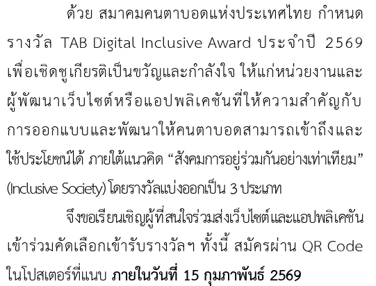 Home/ข่าว/ข่าวประชาสัมพันธ์/ขอเชิญผู้สนใจส่งเว็บไซต์และแอปพลิเคชันเข้าร่วมคัดเลือกรางวัล TAB Digital Inclusive Award ประจำปี 2569